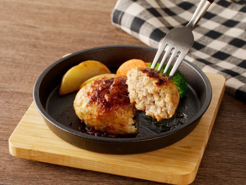 ふわっ!プリッ!のやわらか食感と、豊かな豚の旨味とコクがぎゅっと詰まったふっくらジューシーなハンバーグ。